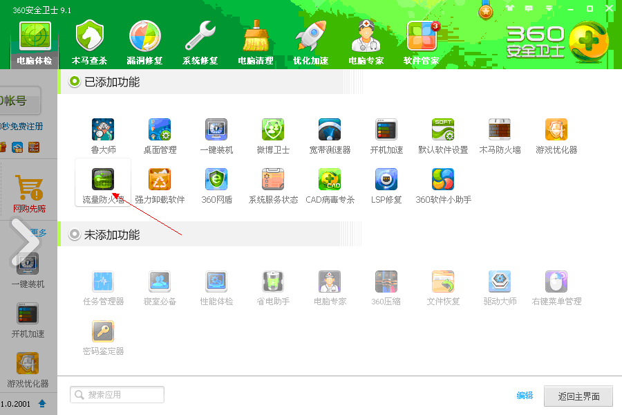 第二步:在已添加功能菜單里,找到流量防火墻 點擊進入即可