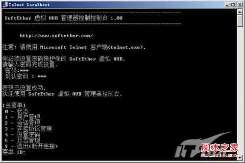 作為服務器,首先從開始菜單中啟動“SoftEther虛擬HUB管理器”,在彈出的窗口中默認選擇本地計算機,然后單擊“連接”按鈕,這樣即會打開“TelnetLocalhost”窗口,并會要求設置密碼保護SoftEther虛擬HUB,輸入密碼后再次確認,會提示密碼設置成功,并進入功能菜單(圖2),在這里我們需要為客戶端創建一個用戶,因此在“菜單ID”后輸入“1”選擇用戶管理并回車,此時會打開用戶管理的二級子菜單,按下“2”創建新用戶,這時會要求輸入創建的用戶名回車后,繼續設置密碼,接下來還會進行多個安全選項設置,建議直接按下回車使用默認值即可。