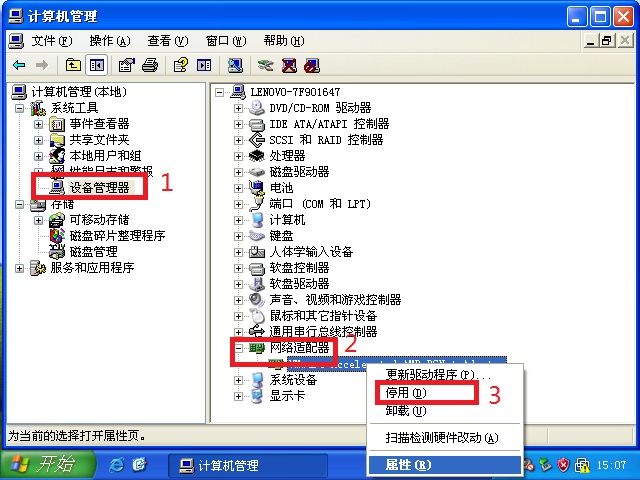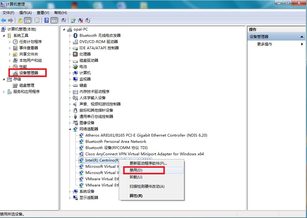 在彈出窗口計算機管理中選擇“設(shè)備管理器”,查看右側(cè)“網(wǎng)絡(luò)適配器”,根據(jù)BOM中無線網(wǎng)卡型號選擇對應(yīng)的無線網(wǎng)卡(如:BCM、intel或802.11等字樣),右鍵選擇該設(shè)備單擊禁用即可。如下圖所示
