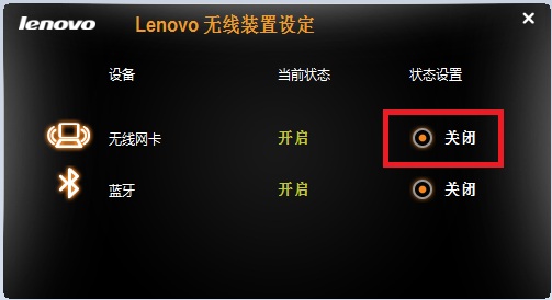 也可以使用快捷鍵:Fn+F5,將無線網(wǎng)卡狀態(tài)選為“關(guān)閉”也可禁用無線網(wǎng)卡,如下圖所示: