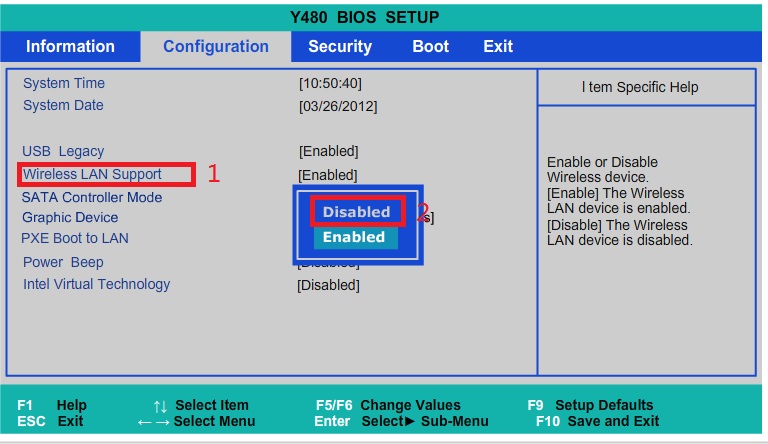 注:若為筆記本,大部分機型可以在BIOS中禁用無線網(wǎng)卡。參考BIOS虛擬頁面(下圖以Y480BIOS為例):http://10.99.109.13/webtools/