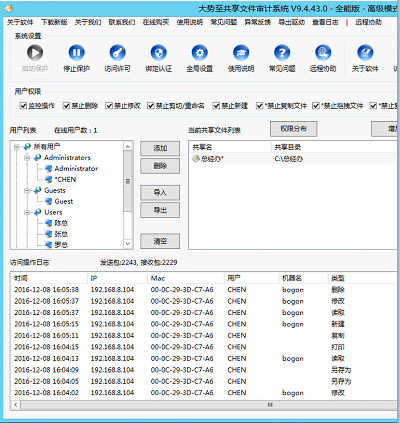 此外,通過大勢至企業(yè)文件共享平臺軟件還可以詳細記錄局域網(wǎng)用戶對共享文件的訪問日志,詳細記錄共享文件的打開、復(fù)制、修改、刪除、剪切、重命名、打印、另存為、讀取等所有權(quán)限,并可以詳細記錄訪問者的IP地址、MAC地址和主機名等信息,從而便于用戶事后備查和審計。