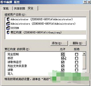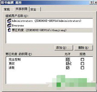 第4步,返回“圖書編撰 屬性”對話框,在“共享權(quán)限”選項卡中選中剛剛添加的用戶(如“寒江釣叟”)。然后在“寒江釣叟 的權(quán)限”列表中選中“完全控制 允許”復(fù)選框,并單擊“應(yīng)用”按鈕,如圖所示。