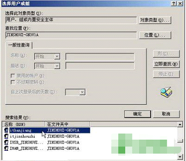 第3步,在打開的“選擇用戶和組”對話框中依次單擊“高級”→“立即查找”按鈕,然后在“搜索結(jié)果”列表框中選擇用戶或組。并依次單擊“確定”→“確定”按鈕,如圖所示。