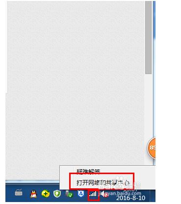 1、右擊電腦右下角的網絡標志,打開“網絡和共享中心”。