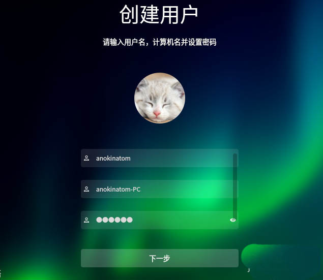11、創建用戶名及密碼。輸入用戶名,自動生成計算機名,輸入密碼,再次輸入密碼確認。然后點擊【下一步】。