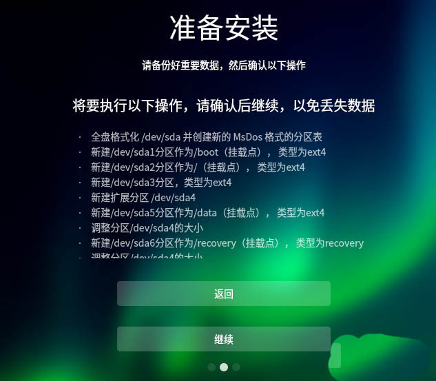 8、系統將被寫入硬盤,如果需要修改的話,點擊【返回】進行相關的操作。確認無誤的話,點擊【繼續】。