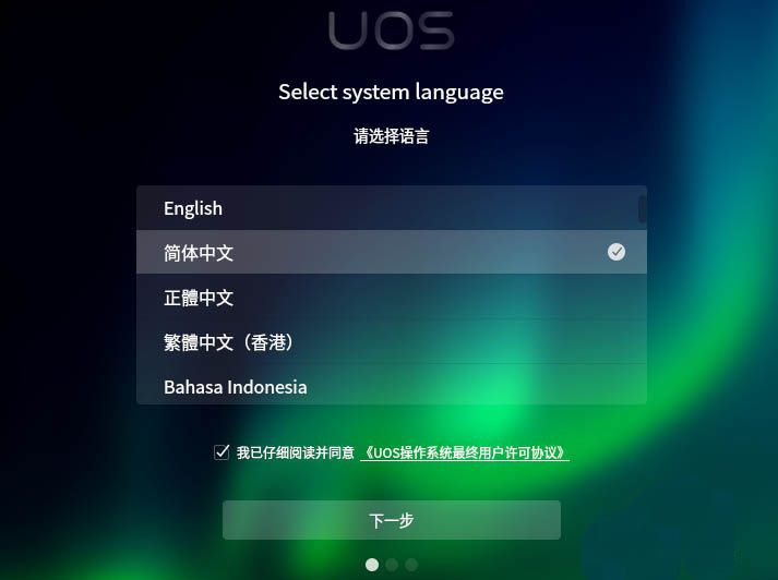 6、進入安裝界面,選擇要安裝的語言,勾選下面的協議,點擊【下一步】。
