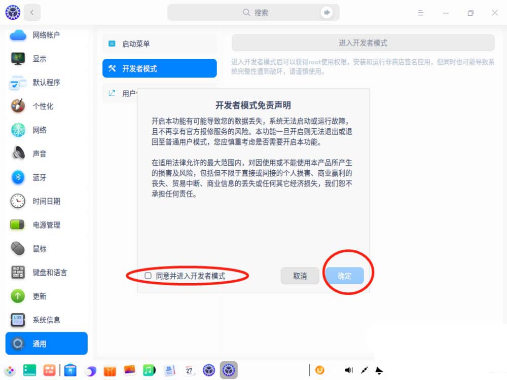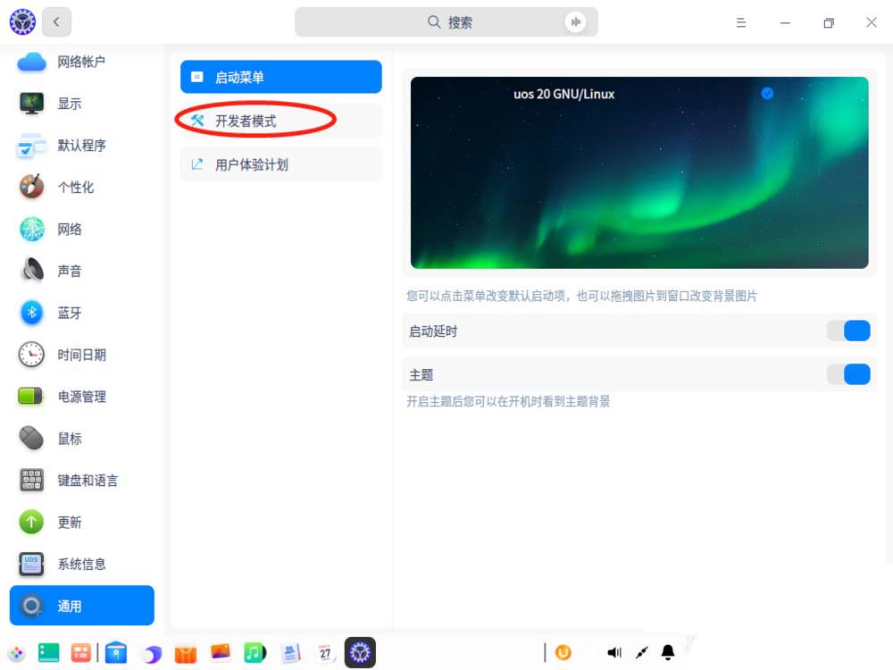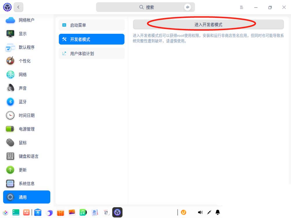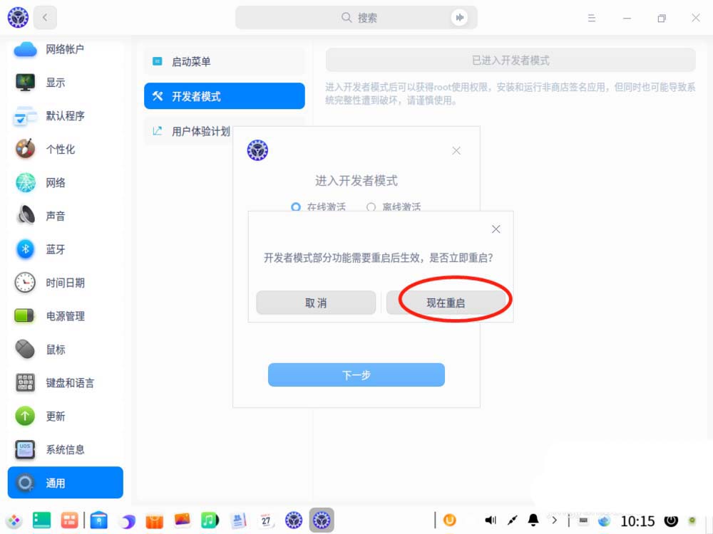 對于已經(jīng)聯(lián)網(wǎng)的設(shè)備可以直接轉(zhuǎn)到UOS系統(tǒng)的控制中心(即設(shè)置)、通用、開發(fā)者模式、在線激活即可開啟該模式。