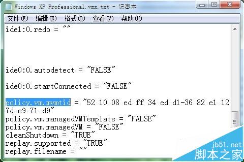 3、用記事本打開重命名后的“.vmx.txt”文件,找到行:policy.vm.mvmtid = "52 10 08 ed ff 34 ed d1-36 82 e1 127d e9 71 d9"并刪除,如圖: