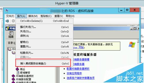 4、在菜單欄的操作下面,選擇 插入集成服務(wù)安裝盤(pán)