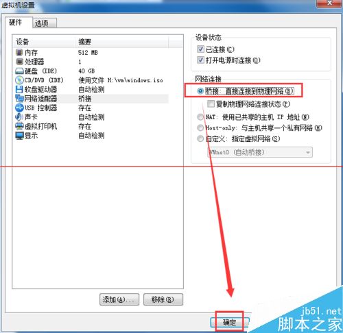 5、在“網絡適配器”中我們將網絡連接方式由“NAT" 改為“橋接”,即直接連接到物理網絡,這樣虛擬機和物理主機就處于在同一網段了,如圖所示: