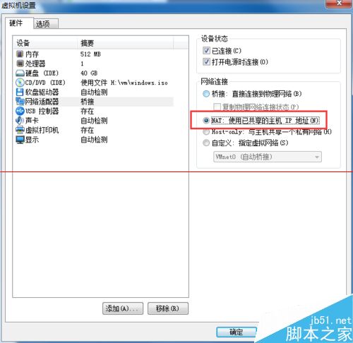 4、在虛擬機設置界面中,有虛擬機的各項硬件設置選項,我們這里選擇”網絡適配器“,在“網絡適配器”中可以看到,默認的網絡連接方式是“NAT",如圖所示: