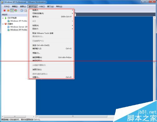 2、點擊菜單欄上的“虛擬機”按鈕,打下拉菜單,如圖所示: