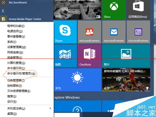 5、重新啟動完成后,點擊操作系統開始窗口,選擇命令提示符(管理員),后面操作的命令需要管理員的權限才能操作。
