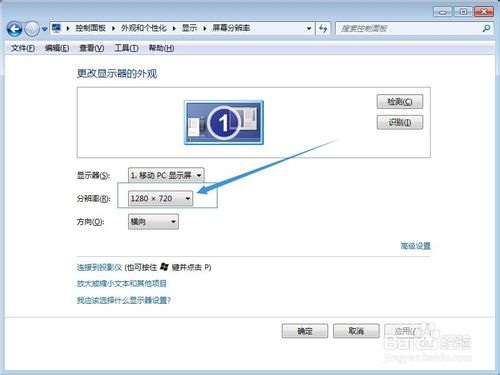 3、在顯示屬性窗口中的設置標簽下,設置分辨率與主機一致,即為“1280X720”。然后點擊確定