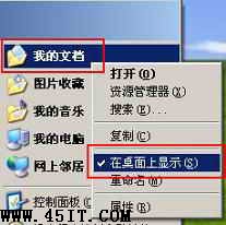 點擊“開始”菜單——>在右邊找到“我的文檔”——>在“我的文檔”上點擊鼠標右鍵——>將“在桌面上顯示(S)”前面打勾即可;