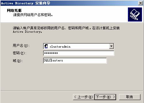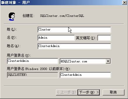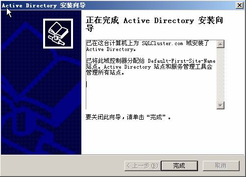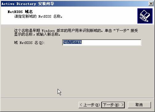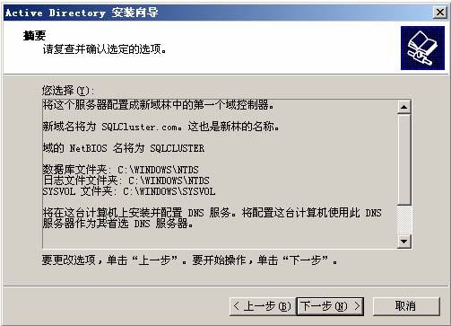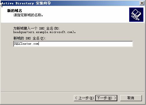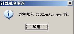 13. 在新域的DNS 全名中輸入:SQLCluster.com ,即剛才DNS 中正向查找區域中配置的區域名稱
