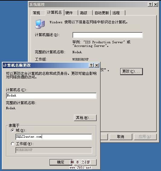 30. 分別NodeA 、NodeB 中右鍵點擊我的電腦,更改計算機設置為域SQLCluster.com