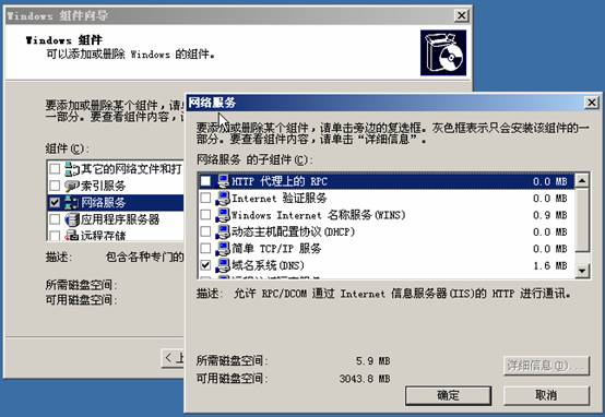 2. 在控制面板中運行添加刪除windows 組件,選擇網絡服務,選擇域名系統DNS