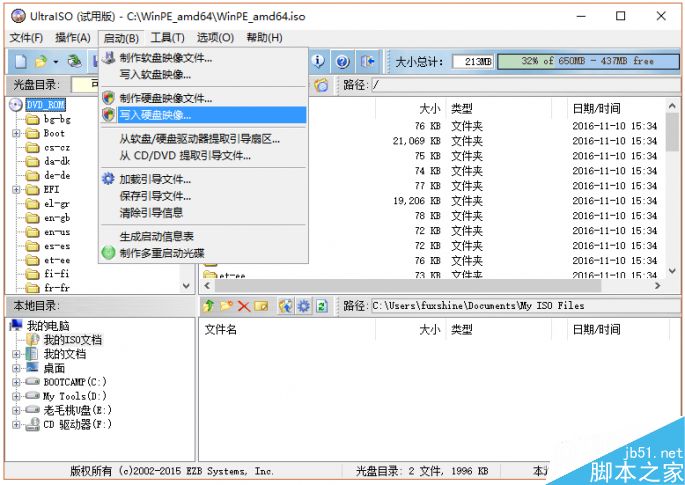 現在大家只要使用UltraISO(軟碟通),選擇“啟動-寫入硬盤映像”功能,將剛才制作好的WinPE_amd64.iso做成啟動U盤,純正的微軟WinPE維護盤就算制作成功。