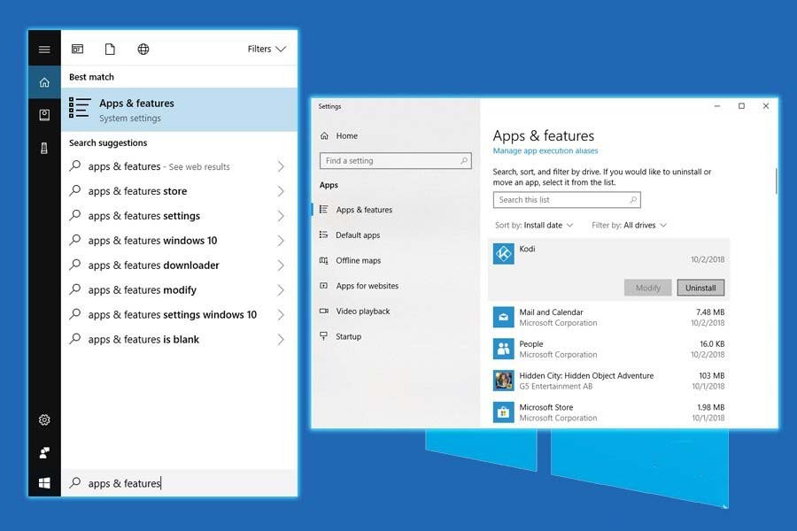單擊“ 開始”按鈕,鍵入“ 應用和功能”,然后選擇“系統設置”結果