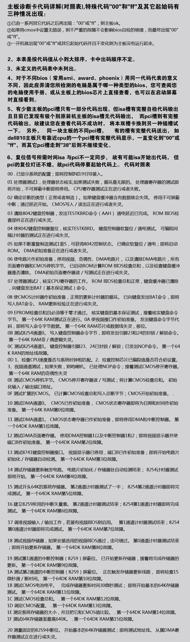 主板診斷卡代碼詳解(對(duì)照表),特殊代碼“00”和“ff”及其他其實(shí)代碼有三種含義,如下。