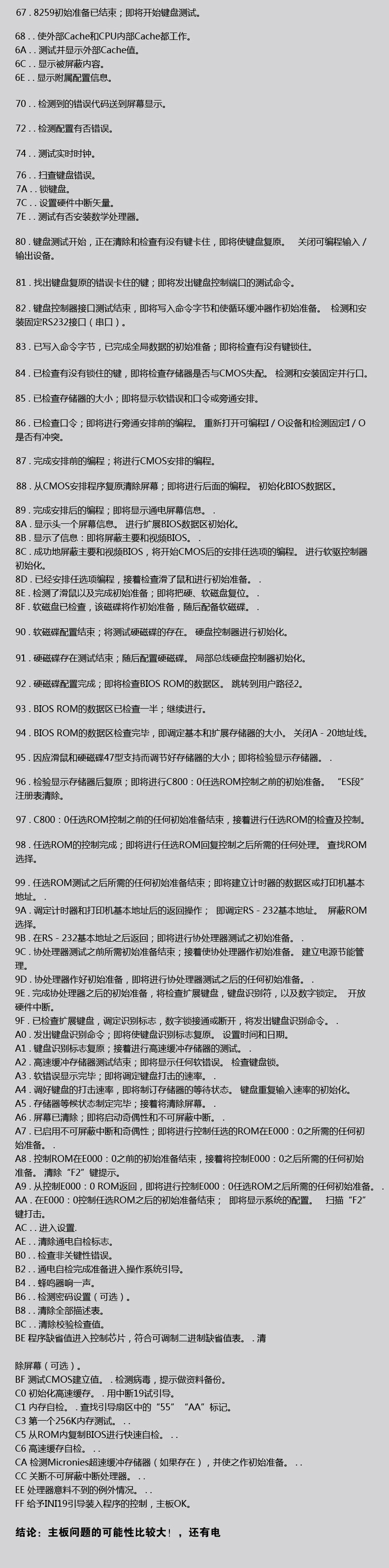4) 如果在最小系統(tǒng)下沒發(fā)現(xiàn)問題,再利用逐步添加法,逐一添加其他設(shè)備,觀察診斷卡顯示代碼的情況,找出故障件。