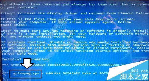 4、當然,對于一般的用戶來說,這個原因猶如天書一般,無法知曉導致藍屏故障的實際原因和解決問題的具體方法。好在這個藍屏截圖的底部還有一個導致藍屏故障的系統文件名為atikmpag.sys。