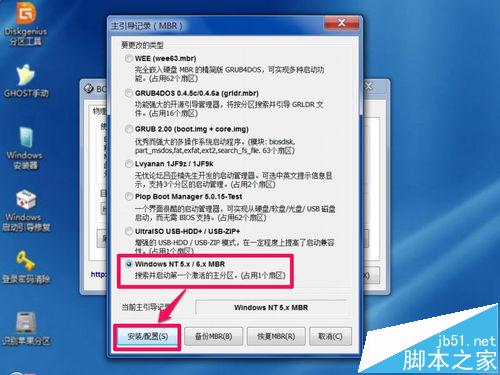 7、如果是舊版本的bootice軟件,XP選擇nt5.x,Win7選擇nt6.x,現在新版,nt5.x/nt6.x混在一起,統一選擇一項即可。選好后,按“安裝/配置”這個按鈕。