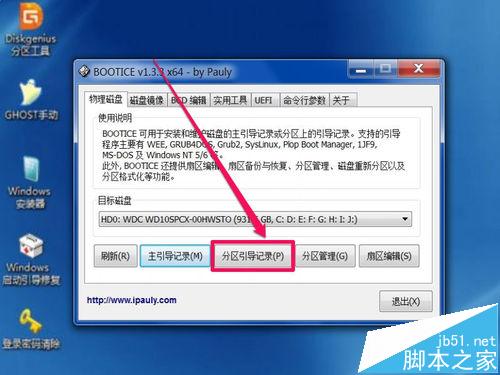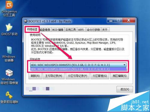 5、進入PE后,打開這個bootice軟件,在物理磁盤選項下,先選擇目標磁盤,默認是U盤,必須選擇要修復的硬盤,根據名稱或容量來判斷哪個是要修復的硬盤。