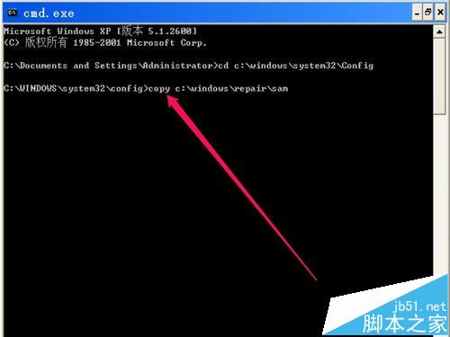 5、等切換目錄成功后,再輸入下一條copy c:/windows/repait/sam命令,按Enter鍵回車。這條命令的意思是,把c:/windows/repait/文件夾下的sam文件,復(fù)制到當(dāng)前文件夾(即替換c:/windows/system32/Config文件夾下的SAM文件)。