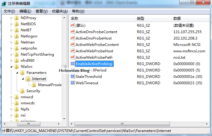 一開始在服務中一直都沒有找到這個叫做Network Connectivity Status Indicator (NCSI)服務,結果發現這家伙是直接寫在注冊表的服務項里的(HKEY_LOCAL_MACHINE/SYSTEM/CurrentControlSet/services/NlaSvc),并沒有顯式表現出來,這讓人不得不懷疑這服務是否本意就含有收集客戶端信息來進行統計。需要關閉修改注冊表鍵值HKEY_LOCAL_MACHINE/SYSTEM/CurrentControlSet/services/NlaSvc/Parameters/Internet/下的EnableAcetiveProbing值為0即可,如圖。
