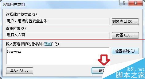 5、此時系統會補齊賬戶名Everyone(所有人)→確定,關閉所有的設置框,從而完成設置權限獲取。