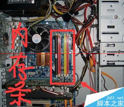 3.2打開電腦機箱,在電腦機箱內找到主板上的內存條,如圖