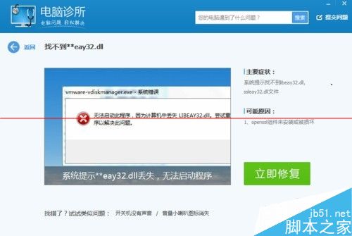 1、管家的電腦診所功能針對軟件專區可以修復文件缺失問題,修復點為”找不到**eay32.dll,一鍵修復,即可完成修復。