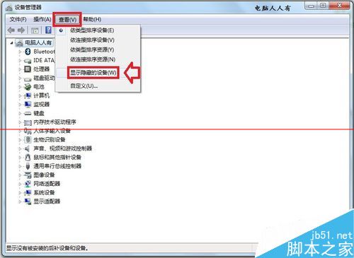 5、點(diǎn)選工具欄上的查看▶顯示隱藏的設(shè)備