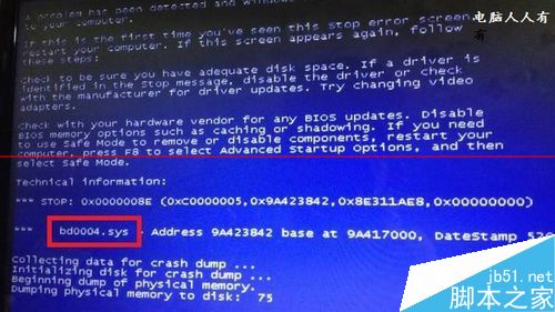 3、僅憑原因是無法正確定位的,但是藍(lán)屏的截圖中還有引起藍(lán)屏故障的文件名:bd0004.sys 這是問題的關(guān)鍵!