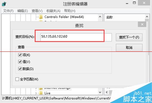 4、打開注冊表編輯器點擊查看下面的查找輸入58.135.68.102:80因為在我這里是一直處于這個ip所以我輸入來查找它。