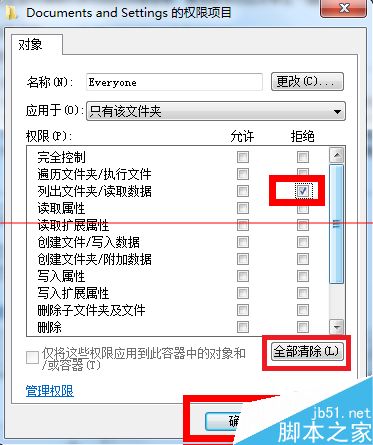 3、在Documents and Settings高級設置頁面的權限選項卡,選擇拒絕類型后的everyone,點擊下方的更改權限!如下圖所示!
