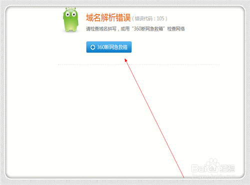 1、打開360安全瀏覽器,聯(lián)網(wǎng)半天之后,出現(xiàn)“域名解析錯誤,錯誤代碼105”。多次聯(lián)網(wǎng),都失敗。點擊“360斷網(wǎng)急救箱”。