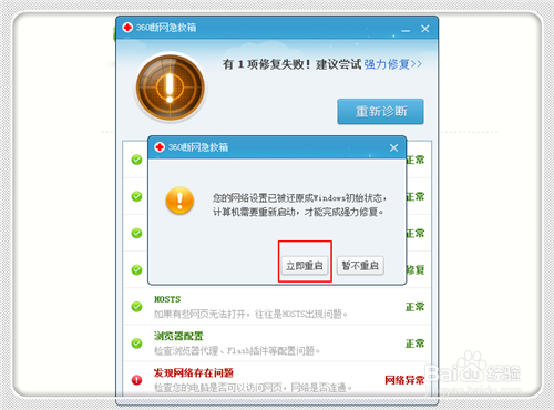6、強力修復(fù)完畢,需要重啟計算機生效,點擊“立即重啟”。