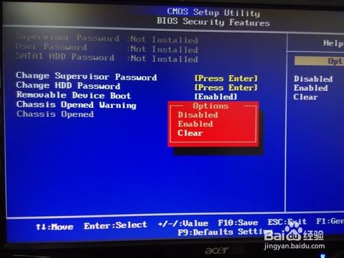 4、之后,選擇到Enabled”狀態上,點擊回車鍵。會出現Enabled、Disabled 、Clear三個選項。選擇Disabled為禁止此提示,也就是以后開機后不會再提示。選擇“Clear”為清除,以后開機還是會提示。大家可以根據自己的需求來選擇。一般選擇“Clear”就行了。“Enable”為開啟狀態。在此選擇“Disabled”狀態。