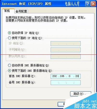 4、按照官網給出的DNS地址填好:202.106.0.20 →確定