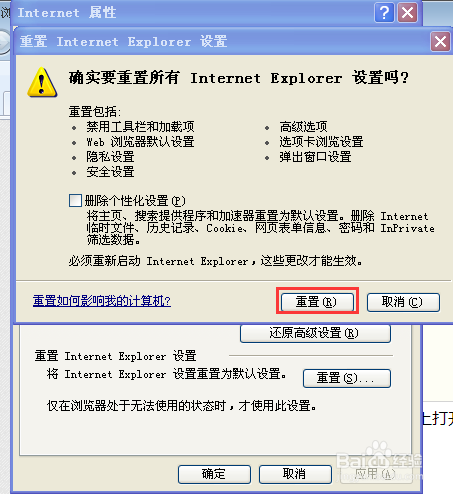 2、在瀏覽器工具上打開Internet選項→高級→重置→重置,確定重新打開游覽器。