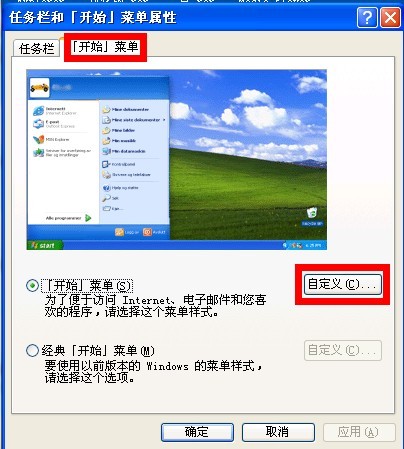 2、在彈出的窗口單擊“「 開始 」菜單”選項卡,然后選擇“自定義”