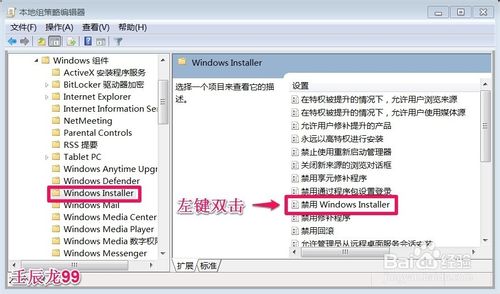 4、在windows Installer對應(yīng)的右側(cè)窗口,找到禁用windows Installer,并左鍵雙擊:禁用windows Installer;