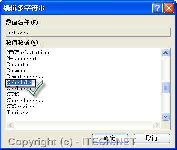 在右側定位到對應的鍵值,本例是netsvcs,在其數值數據里添加該服務名即可,本例是Schedule,如圖5所示,并重啟系統。