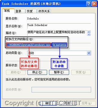很簡單,首先打開該服務的屬性對話框,查看其可執行程序的命令參數(本例是netsvcs),如圖2所示。