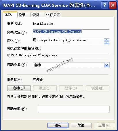 看來問題確實出在這里,雙擊IMAPI CD-Burning COM Service打開其屬性對話框,將“啟動類型”改為“自動”。(如下圖)
